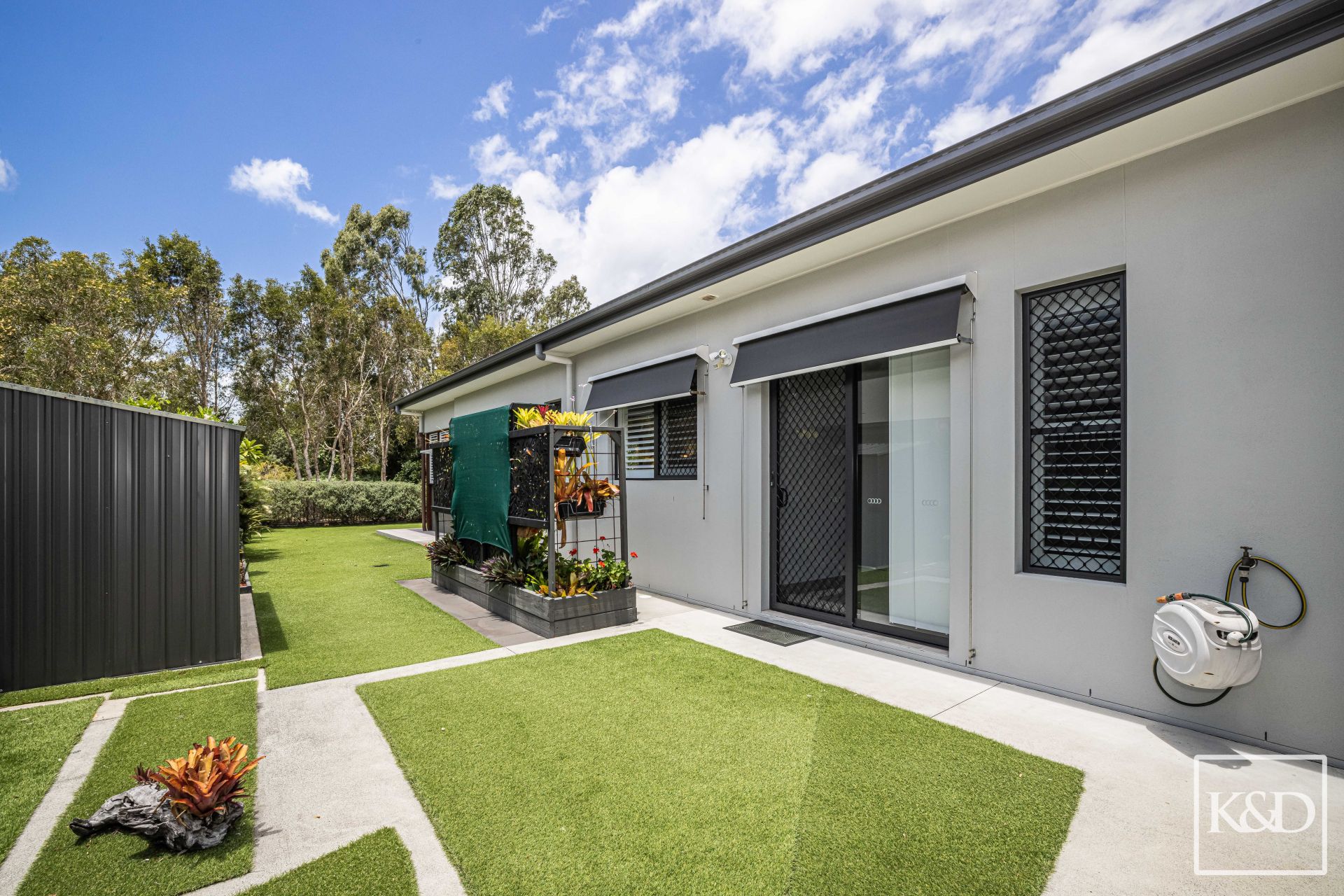 • Low maintenance gardens + storage shed