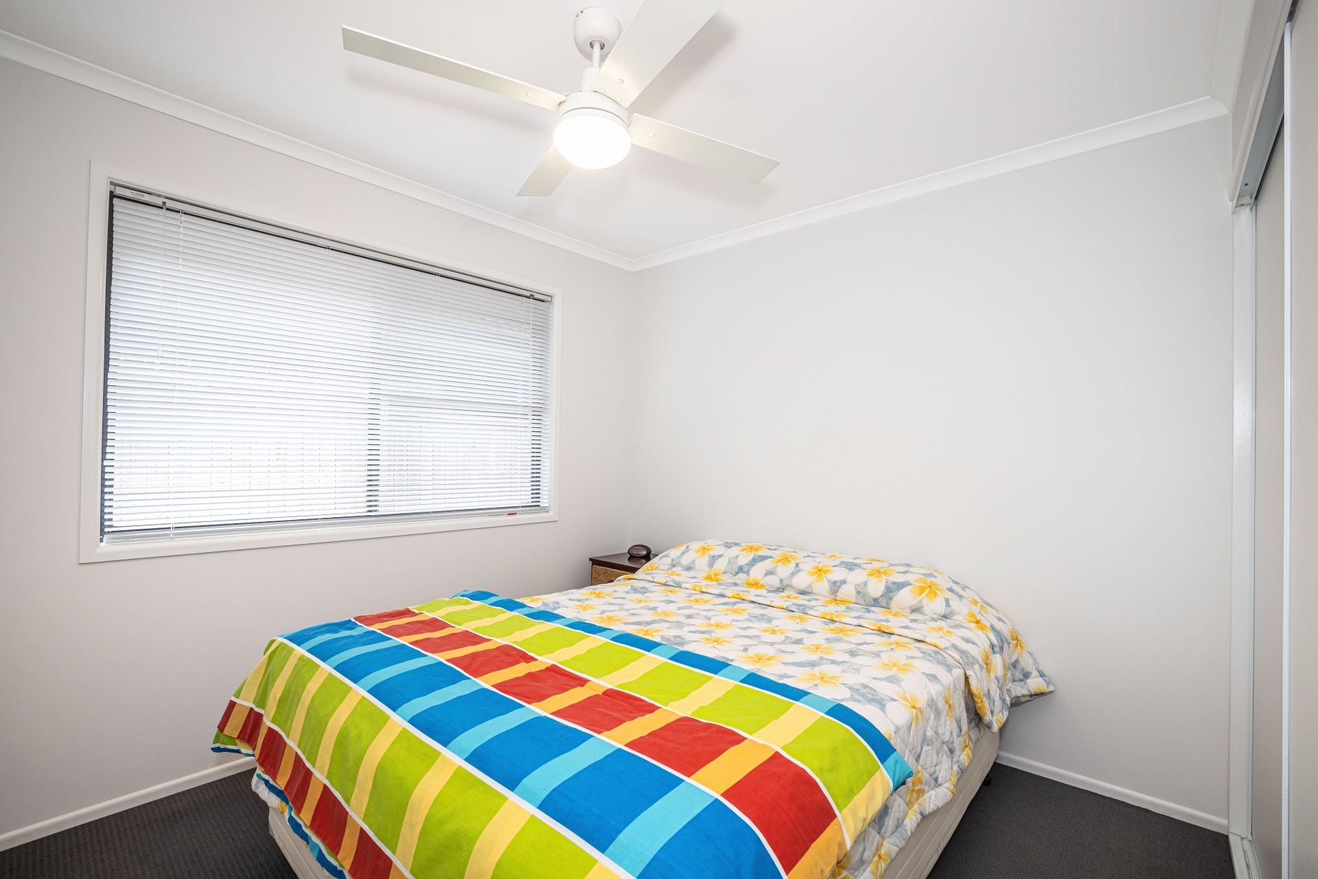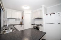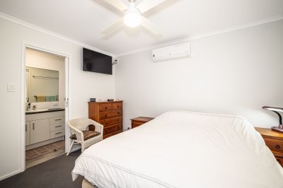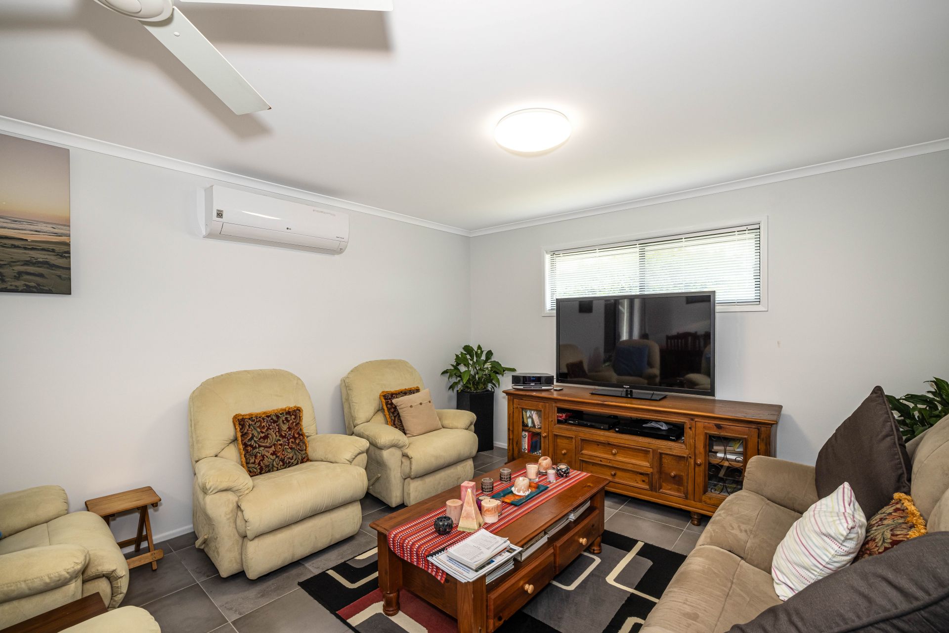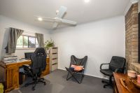 The original patio has been enclosed and converted into a versatile study or additional living space, ideal for those working from home or seeking a quiet retreat. The kitchen is compact and efficient, positioned to service the combined dining and lounge area, which is fitted with air conditioning and a ceiling fan for year-round comfort.