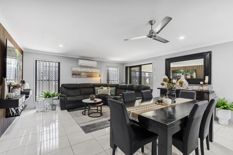 Magnificent open plan lounge and dining area, useful Mitsubishi air conditioning and ceiling fan, sliding doors to the under cover outdoor entertainment area.